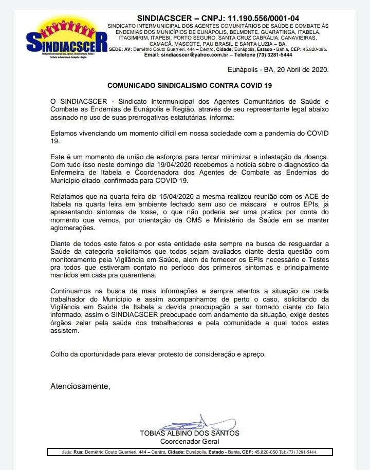 Após o recebimento do boletim informativo contendo o nome de uma enfermeira que recebeu diagnostico para o coronavírus, o sindicato solicita respostas imediatas ao pedido de exames em todos os funcionários “Agentes de endemias de Itabela” que tiveram contato direto com a enfermeira no dia 15/04/2020.