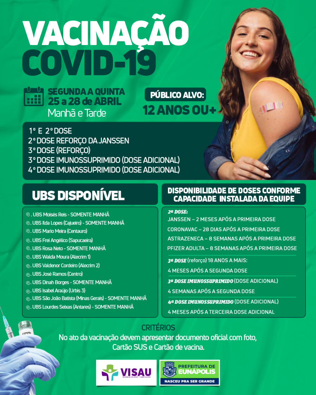 Para o público a partir dos 12 anos, a vacinação acontece das 8h30 às 11h30 e de 14h às 16h30 nas unidades de saúde dos seguintes bairros: Centauro, Sapucaeira, Centro, Urbis 3, Alecrim I e II. Já nas UBSs do Moisés Reis, Cajueiro, Rosa Neto, Dinah Borges, Minas Gerais e Antares, a imunização será realizada apenas pela manhã.