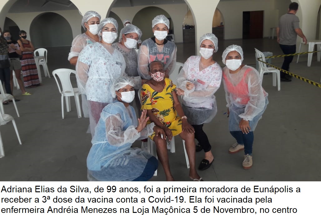 Uma mulher, de 99 anos, foi a primeira moradora do município a receber o imunizante. Em seguida, um homem, de 94 anos, também foi imunizado com a 3ª dose. As vacinas Pfizer foram aplicadas na Loja Maçônica 5 de Novembro, no centro da cidade.
