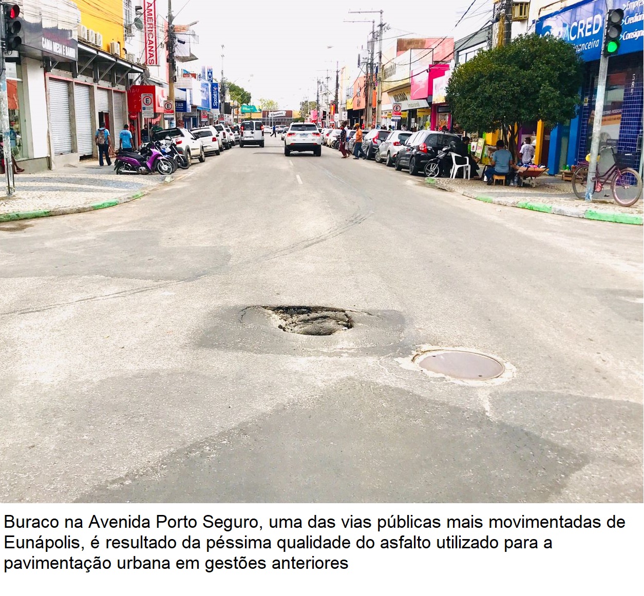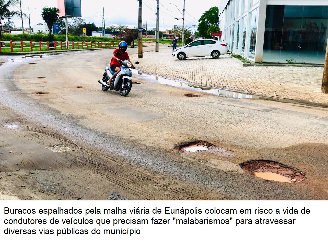 De diferentes tamanhos e profundidades, os buracos são enormes problemas para quem trafega pelas vias públicas de Eunápolis. As erosões são resultado da péssima qualidade do asfalto que foi aplicado na malha viária durante os anos anteriores, demonstrando o desperdício do dinheiro público.