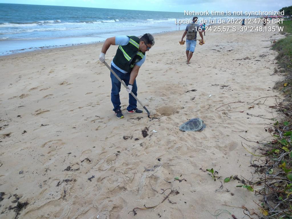Após chamado para resgate de uma tartaruga marinha, na Orla Norte de Porto Seguro, agentes de Fiscalização Ambiental, da Secretaria Municipal de Meio Ambiente e Causa Animal (Semac), recolhe o animal, que infelizmente não resistiu, neste sábado, 2/7.
