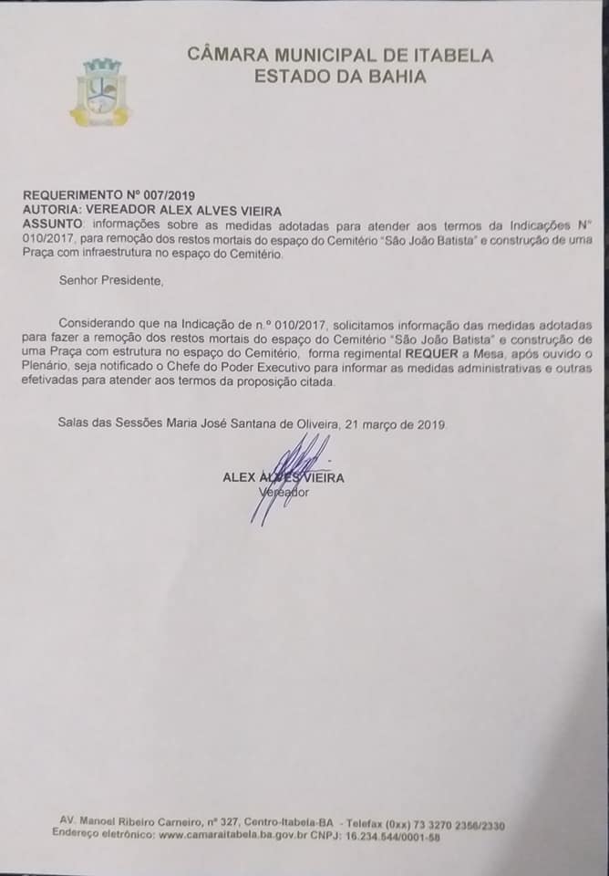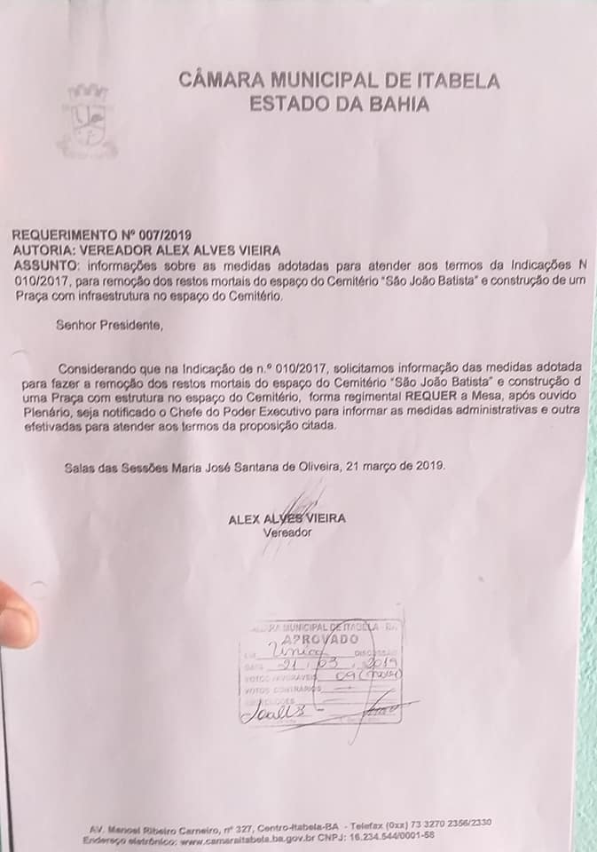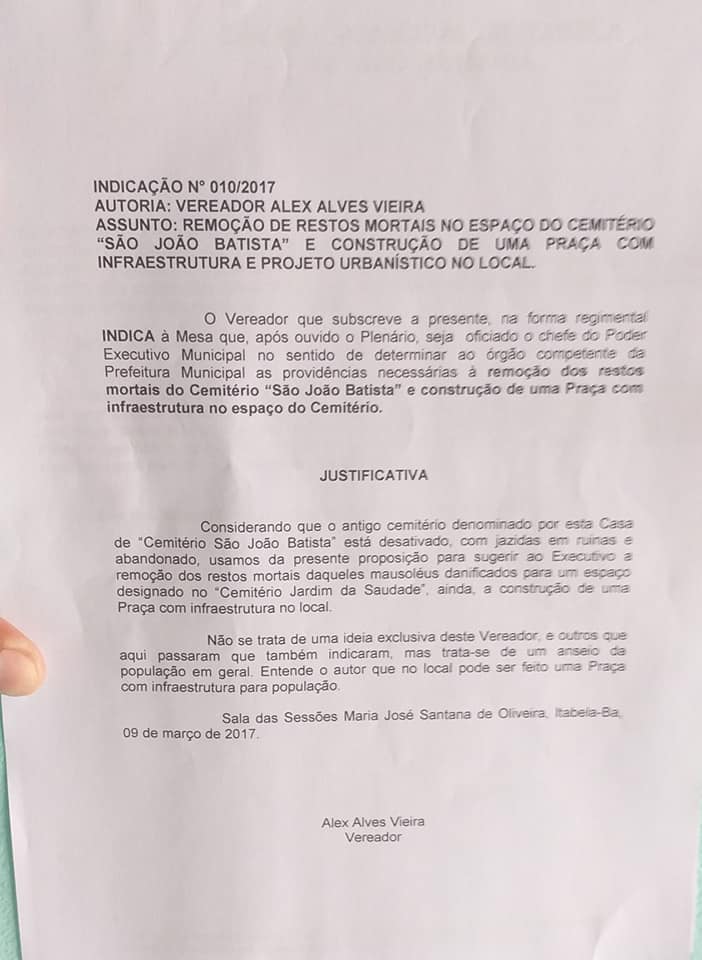 Em respeito à memória daqueles que jazem, e aos parentes em luto, o vereador Alex Alves, encaminhou para o executivo a indicação de número 10/17, após votação e aprovação na Câmara de vereadores.