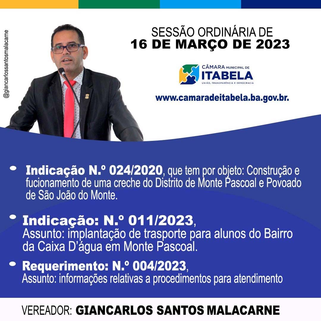 Com a missão de dar voz ao povo de Itabela junto ao gestão municipal, o vereador Giancarlos Santos Malacarne (PROS/BA), tem trabalhado incansavelmente na Câmara Municipal no sentido de apresentar e convencer os seus pares a aprovar projetos de lei fundamentais para o desenvolvimento do município, principalmente nas localidades de Monte Páscoa, distrito de Montinho entre outras.